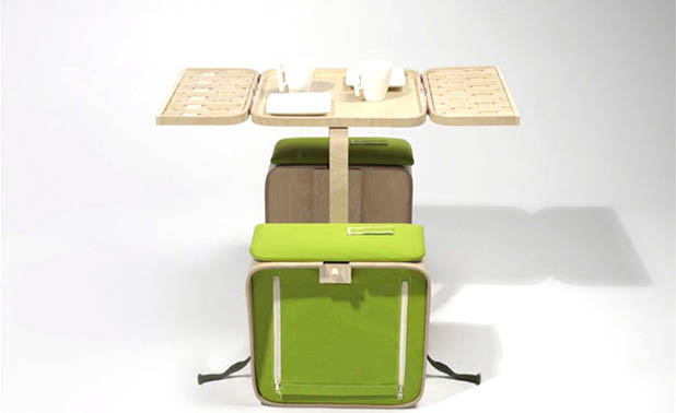 Dividida em dois compartimentos, a cesta é flexível e pode ser acoplada ao suporte traseiro de uma bicicleta, facilitando seu transporte. No local de chegada, ela pode ser reconfigurada para se transformar em uma mesa. Como a parte superior da cesta é acolchoada, seus compartimentos podem ser utilizados como banquinhos – ideal para quem não quer sentar na grama.